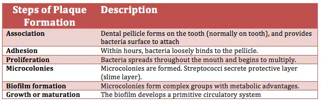 The bacterial equilibrium position varies at different stages of formation. Below is a summary of the bacteria that may be present during the phases of plaque maturation:
