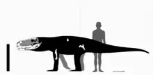 This does however leave the issue of determining body size from skull length. This is rendered especially difficult by the lack of fully preserved postcranial skeletons for members of this group, which means that body size is generally estimated based on the proportions of other terrestrial Notosuchians, leading to vastly different results. Using the proportions of the incomplete peirosaurid Uberabasuchus for example would give Dentaneosuchus a body five to six times longer than its skull. Using the baurusuchid Stratiotosuchus, Molnar and de Vasconcellos calculated that the body length of Barinasuchus could range anywhere from 6.3 m (21 ft) to a gigantic 10 m (33 ft).[7] Martin and colleagues suggest a much more conservative body length with a proportionally bigger head, estimating the total body length of the two at between 3–4 m (9.8–13.1 ft). Regardless of the specifics, this renders Dentaneosuchus the largest terrestrial predator of Cenozoic Europe.[5]