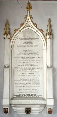 - Lucilla Rolle (1757–1851), baptised at East Tytherley, died 24 July 1851 aged 94.[2] In her old age she was allowed by her brother Lord Rolle to live with her sister Anne at Hudscott but after the latter's death and the death of Lord Rolle both in 1842 she was declared a lunatic in 1846.[7]