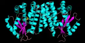 Deoxycytidine kinase (dCK) is an enzyme which is encoded by the DCK gene in humans.[5] dCK predominantly phosphorylates deoxycytidine (dC) and converts dC into deoxycytidine monophosphate. dCK catalyzes one of the initial steps in the nucleoside salvage pathway[6] and has the potential to phosphorylate other preformed nucleosides, specifically deoxyadenosine (dA) and deoxyguanosine (dG), and convert them into their monophosphate forms.[7] There has been recent biomedical research interest in investigating dCK's potential as a therapeutic target for different types of cancer.[6][7][8]