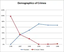 The Crimean War triggered another mass exodus of Crimean Tatars. Between 1855 and 1866 at least 500,000 Muslims, and possibly up to 900,000, left the Russian Empire and emigrated to the Ottoman Empire. Out of that number, at least one third were from Crimea, while the rest were from the Caucasus. These emigrants comprised 15–23 percent of the total population of Crimea. The Russian Empire used that fact as the ideological foundation to further Russify "New Russia".[13] Eventually, the Crimean Tatars became a minority in Crimea; in 1783, they comprised 98 per cent of the population,[14] but by 1897, this was down to 34.1 per cent.[15] While Crimean Tatars were emigrating, the Russian government encouraged Russification of the peninsula, populating it with Russians, Ukrainians, and other Slavic ethnic groups; this Russification continued during the Soviet era.[15]