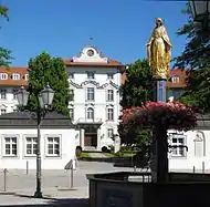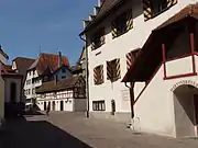 Now called Bad Wurzach, ‘Ilag V-C’ was a branch camp of Ilag V-B. It was about 30 miles south of Biberach and had also previously been an Officers camp. In October 1942, 618 Channel Islanders were transferred there from Biberach. More arrived in November from Dorsten. They were accommodated in the Schloss, a 17th-century mansion that had been a Catholic training college. They were made to scrub the filthy buildings clean within a week. It contained a hospital, theatre, storerooms, cellars and accommodation for men and women in different communal rooms housing up to 30 with bunk beds. Some families with very small children had a private room.[1]: 73–75 A school for the 130 children was set up but they had no qualified teacher.