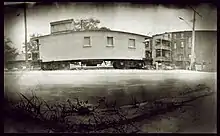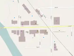 At the southwest corner of the same intersection, the building housing Sidetrack Bar & Grill—which has held a bar and restaurant continuously since at least 1850—has an unusual shape resulting from a 1929 train derailment. On an early January morning, the twelfth car, laden with lumber, of an 85-car freight train came off the tracks and crashed into the corner of the building. The owner of the building, who lived just above the section that was hit, was uninjured but had most of her personal effects scattered into the street. There were only a few people near the railroad crossing when it derailed including an 18-year-old female who was knocked unconscious and a man who was sitting in his car, but was able to get away unharmed.[20] When the current owners went to build a patio on the spot, they found some of the debris had been piled up underneath, which made it more difficult to dig post holes.[21] In 1931, the entrance to the building was moved from the east side to its current position on the north side to accommodate a post-prohibition law requiring bar entrances to be at least 500 feet from any church. The back patio was constructed after the nearby church burned down.[21] According to Sidetrack owner Linda French, the first-floor walls are three bricks deep, with the oldest remaining bricks dating to the 1850s.[22]