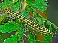 The larvae are pale yellow, with a pale orange head, with well marked brown lozenges and two brown side lines on the back,