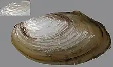| Left valve of Pseudanodonta complanata showing close-up of rugae on the umbo | |