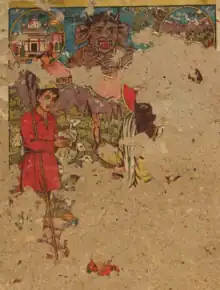 ![]() Vadbhag Singh (right, damaged depiction). Illustration from a janamsakhi about his life. | |