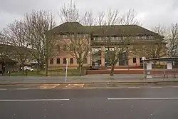 The new building was designed by the Property Services Agency in the Modernist style, built in red brick at a cost of £7.4 million,[5] and was officially opened by the Lord Chief Justice, Lord Lane, on 17 May 1989.[3] The design involved an asymmetrical main frontage of thirteen bays facing onto Morledge. The left hand section, which was projected forward, was fenestrated with tall casement windows on the ground floor and round headed windows on the first floor. The right hand section featured, on the left, three full-height recesses enclosing three glass doorways leading to an atrium. There was a large Royal coat of arms above the central doorway and, on the right, there were four more bays fenestrated with tall casement windows on both floors. There was also an attic level fenestrated by small bi-partite windows and surmounted by prominent eaves. Internally, the building was laid out to accommodate nine courtrooms.[6]