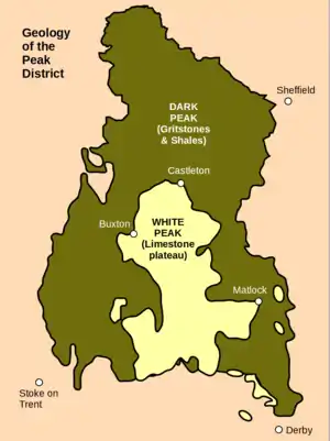 The White Peak area of the Peak District is named after the limestone plateau landscape of the 'Derbyshire Dome' anticline. The plateau is generally between 200m and 300m above sea level. This limestone outcrop is surrounded on the west, north and east by a horseshoe-shaped formation of younger sandstones (gritstones) and shales, known as the Dark Peak. The town of Buxton is at the western edge of the limestone region. The Triassic sandstones of the Midlands plain bound the south edge of the limestone region. The other main karst landscapes of England are the Yorkshire Dales and the Mendip Hills.[1][2]