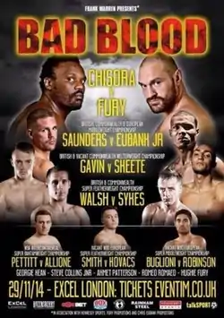 Derek Chisora vs Tyson Fury II, billed as The Fight for the Right and Bad Blood, was a professional boxing match contested between European and WBO International heavyweight champion, Derek Chisora, and Tyson Fury, with the vacant British heavyweight title also on the line. The fight was a WBO "eliminator", with the winner becoming the mandatory challenger for the WBO heavyweight title, held at the time by Wladimir Klitschko. The bout took place on 29 November 2014 at the ExCel, with Fury winning by corner retirement in the tenth round.