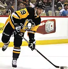 Brassard had a slow start to the 2018–19 season, with only one goal and four assists through eight games before suffering another groin injury on October 27 that caused him to miss nine games.[118] He continued to struggle upon returning to the line-up, with only three points in 17 games by the Christmas break. In addition to lower body injuries limiting Brassard's effectiveness on the ice, he lacked stable linemates: although he seemed comfortable on captain Sidney Crosby's left wing, that position was filled by Jake Guentzel, and Brassard was subsequently demoted to third-line center.[119] In 40 games for Pittsburgh during the 2018–19 season, Brassard scored only nine goals and a total of 15 points.[120] He told reporters after the fact that he had difficulties finding a permanent, rewarding role within the Penguins organization. In addition to feeling outcast among Pittsburgh's strong core of skaters, Brassard had set personal goals of 50 to 60 points that season, which was made difficult by the limited playing time of a bottom-six forward.[121]