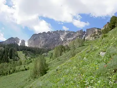 Deseret Peak is the highest peak in the Stansbury Mountains with an elevation of 11,035 ft. It is located in the Deseret Peak Wilderness area west of Grantsville, Utah and east of Skull Valley Indian Reservation. It is the fourth most topographically prominent peak in the state of Utah.[4] The site is a popular destination for hikers and backcountry skiers as the area is a contrast of the alpine wilderness with the surrounding desert basin. The trail that leads to the peak is easily accessible from Salt Lake City. The mountain offers views of the Bonneville Salt Flats, the Great Salt Lake, and the surrounding towns and mountain ranges. On a clear day, it is possible to see Mount Nebo, the highest peak in the adjacent Wasatch Mountains.