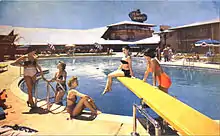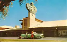 The interior of the hotel was finished in redwood with flagstone flooring.[12] The public space included a registration area, a casino, two bars, a coffee shop, a restaurant, various commercial shops and services, and a broadcasting station for K-RAM radio.[12] Guest rooms were located in wings situated behind the main building, surrounding the figure-eight swimming pool.[12] The hotel originally had 300 rooms, each outfitted with air conditioning with individual thermostats.[7][22]
