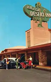 The hotel was situated at 3145 Las Vegas Boulevard South, between Desert Inn Road and Sands Avenue.[3] The original name was Wilbur Clark's Desert Inn. Wilbur Clark, described by Frank Sinatra biographer James Kaplan as a "onetime San Diego bellhop and Reno craps dealer",[4] originally began building the resort with his brother in 1947 with $250,000, but ran out of money. Author Hal Rothman notes that "for nearly two years the framed structure sat in the hot desert sun, looking more like an ancient relic than a nascent casino".[5] Clark approached the Reconstruction Finance Corporation for investment, but it was struggling financially. In 1949, he met with Moe Dalitz, the head of the notorious Cleveland Syndicate, which had ties to the Mayfield Road Mob, and Dalitz agreed to fund 75% of the project with $1.3 million, and construction resumed.[5] Much of the financing came from the American National Insurance Company (ANICO),[6] though Clark became the public frontman of the resort while Dalitz remained quietly in the background as the principal owner. The resort would eventually be renamed Desert Inn and was called the "D.I." by Las Vegas locals and regular guests.[7]