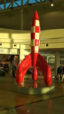 According to literary critics Jean-Marc Lofficier and Randy Lofficier, possible fictional influences on Hergé's story include Jules Verne's 1870 novel Around the Moon and the 1950 American film Destination Moon.[21] Hergé was certainly inspired by a number of photographic stills from the Destination Moon film which had been published.[22] The computer system at the Sprodj space centre was visually based upon the UNIVAC I, the first computer to be created for non-military purposes.[23] Hergé based his Moon rocket on the designs of the V-2 rocket which had been developed by German scientists during World War II.[14] The red-and-white checker pattern on Hergé's rocket was based upon an illustration of a V-2 which Hergé had come upon in Leslie Simon's 1947 book German Research in World War II.[21] He commissioned the construction of a model rocket with detachable parts from his assistant Arthur Van Noeyen. He took the model to Paris where he showed it to Ananoff, asking him if it was realistic representation of what a Moon rocket might look like. He and his assistants then used the model from which to accurately sketch when producing the comic.[24]