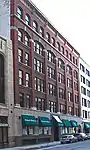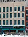 The Traub Brothers Jewelry Building is a four-story wood-frame brick building, built in 1879. Presumably the first floor was used as retail while the upper floors were used as residential space.[27] The building was purchased by Grand Trunk Railroad early in the 20th century, and in 1911 it was renovated to serve as their ticketing office.[1] Grand Trunk removed the second floor and installed a vaulted ceiling reminiscent of period railroad stations.[27] The renovation added a rounded arch on the second floor, filled with paned windows and surrounded by terra cotta detailing with the company's logo.[27] The finely detailed interior woodwork also includes company logos.[27] Although the lower floors of the building were completely altered during this renovation, the upper two floors still retain the original window shapes.[1]