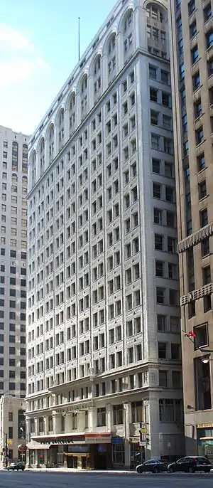 The Standard Savings & Loan Building is an 8+1⁄2-story, flat-roofed office building with a steel frame sheathed in limestone.[1] It was constructed in 1927 designed by Luis Kamper and features work by sculptor Corrado Parducci. Standard Savings & Loan was established in 1893 with offices at the corner of Griswold and Lafayette. The bank moved to the corner of Griswold and Larned in 1913, and in 1927 purchased land at the corner of Griswold and Jefferson, the site of this building. The lot is the site of first building in Detroit, the original Ste. Anne's Catholic Church, constructed in 1701.[22]