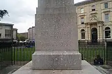 The memorial takes the form of a 30-foot (9.1-metre) granite cross, quarried from Haytor on Dartmoor, and hewn from a single stone—the largest Lutyens was able to acquire.[1][2][13] The cross is formed of a tapering flattened hexagonal shaft to which chamfered arms, no wider than the base, are moulded close to the top. It stands on a three-tiered base and a rectangular plinth, which itself sits on three stone steps as is customary for Lutyens' war memorials. The central tier of the base bears the inscription "THE COUNTY OF DEVON TO HER GLORIOUS DEAD / 1914–1919 / TE DEUM LAUDAMUS / 1939–1945".[1][14] Upon its completion, Lutyens said of the monument, "it is very simple and a monolith and its subtlety in line means labour, care and thought. [...] It should endure forever".[1][13]