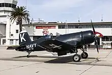 Dillard was determined to create practical effects using real aircraft as much as possible, including several F4U Corsairs, an AD Skyraider, two F8F Bearcat fighters, one of the few remaining flyable HO5S-1 helicopters, and a MiG-15.[18][28][29][26] The 11 aircraft were painted with the dark colors and prominent lettering of the squadrons of the period.[25] Dillard hired aerial stunt coordinator Kevin LaRosa, who created the flight sequences for Top Gun: Maverick.[28][29] A modified L-39 Albatros trainer was used as an air-to-air camera platform.[28][29] Interior footage of actors flying the Bearcat was created using a Hawker Sea Fury with its rear seat modified to resemble a Bearcat cockpit and visible parts of the aircraft painted like a VF-32 Bearcat, allowing actors to simulate piloting the aircraft during actual aerial maneuvers.[29][26] Real audio of a Corsair in flight was captured with five microphones for use in the soundtrack.[30]