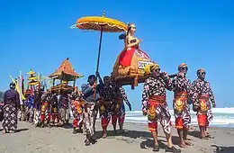 The loro blonyo (two "pedestals" or foundations) statue also have some overlap with Dewi Sri and Sedhana. Balinese people have certain rituals to rever Dewi Sri by making an effigy as her representation from janur (young coconut leaf), lontar leaf, or from cakes made of rice flour.