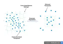Dextran hydrogels and dextran conjugate hydrogels are heavily cross-linked polymeric networks that have a strong affinity for water. These gels have soft, elastic physical properties and are biocompatible and biodegradable.[1] Dextran hydrogels have also been shown to be stable and safe in vivo.[2] Glucose-based polymeric gels have the advantage of being able to be chemically or physically modified to improve targeted drug delivery.[1] Swelling is one mechanism by which drugs are released from the dextran hydrogels. Swelling can be reduced by increasing the molecular weight of dextran, leading to a slower drug diffusion rate out of the hydrogel. Swelling can also be lessened by increasing the amount of the conjugated species and introducing ethanol during the cross-linking reaction.[2][3] Degradation of chemical linkages in the dextran hydrogels is another mechanism by which drugs are released from the polymeric matrices. An increase in degradation of the dextran hydrogel leads to an increase in drug release rate. Degradation of dextran hydrogels specifically is caused by dextranases, which are microbial enzymes mostly located in the colon.[2][3]