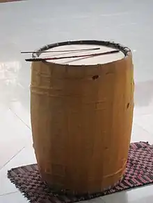 The dhak is a huge membranophone instrument from Bengal and Assam.[1] The shapes differ from the almost cylindrical to the barrel. The manner of stretching the hide over the mouths and lacing also varies. It suspended from the neck, tied to the waist and kept on the lap or the ground, and usually played with wooden sticks. The left side is coated to give it a heavier sound.[2]