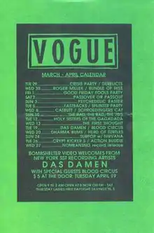 - ↑ Rossi, Melissa. Courtney Love: Queen of Noise. Pocket Books. 1996. ISBN 0-671-00038-1 Page 88: "Nirvana -- now known by the latest in a series of band names that included Throat Oyster, Pen Cap Chew and Ted Ed Fred -- had driven down from the college town of Olympia, Washington, where they then lived, to open up for the Dharma Bums, a local band that boasted some of the town's cutest boys."