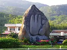![]() Dharma Drum Mountain logo: three mountain peaks and a meditating monk; combined, the logo forms a hand. | |