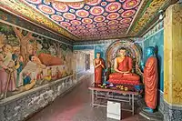 The image house, which is located inside the cave contains numerous colourful murals and painting of Buddha. The entrance to the image house is flanked by two guardian statues, one with a elephant in its mouth and the other with a bull in its mouth. They are reported to be, two Rakshasa leaders, Watuka and Kuvera.[6]