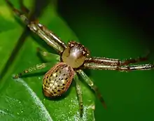 Females are about 6mm in length. Cephalothorax is golden brown, abdomen is tan with faint markings. However, colour is very variable and is assumed to aid camouflage.[1][3]