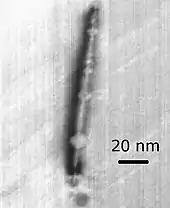 Platelets produce sharp absorption peaks at 1359–1375 and 330 cm−1 in IR absorption spectra; remarkably, the position of the first peak depends on the platelet size.[81][84] As with dislocations, a broad photoluminescence centered at ~1000 nm was associated with platelets by direct observation in an electron microscope. By studying this luminescence, it was deduced that platelets have a "bandgap" of ~1.7 eV.[85]