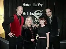 ![]() Diane Hegarty (second from left) and Stanton LaVey (far left) at "Anton LaVey – Art Incarnate" auction in Glendale, California on February 14, 2009[1] | |