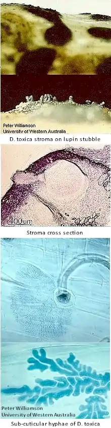 Diaporthe toxica (anamorph Phomopsis sp. formerly P. leptostromiformis var. leptostromiformis)[1] is a lupin endophyte and occasionally a plant pathogen. The fungus produces secondary metabolites that result in toxicosis of animals such as lupinosis of sheep when infected lupins are ingested by animals. The fungus produces mycotoxins called phomopsins, which cause liver damage. Lupinosis has been incorrectly attributed to Diaporthe woodii but has now been shown to be a mycotoxicosis caused by the recently discovered (1994) teleomorphic fungus Diaporthe toxica.[2] The discovery and naming of this fungus concludes over a century of investigation into the cause of lupinosis since the first major outbreak in Germany in 1872. The infection process and life cycle in both resistant and susceptible lupins has been fully elucidated.[3] This is the first record of resistance in a latent infection. Following this research rapid molecular breeding techniques have been developed leading to the production of many resistant lupin varieties. Lupinosis is no longer considered a disease of major importance to livestock producers in Western Australia.[4] Lupins can now become part of the human diet.