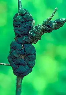 Dibotryon morbosum is a fungus that affects the genus Prunus. Included in this genus are multiple species of trees and shrubs, such as: Dibotryon morbosum infects are Prunus serotina (wild cherry trees), Prunus persica (peach trees), Prunus domestica (plum trees), and Prunus cerasus (sour cherry trees).[3] The main symptom of Dibotryon morbosum is its “knot-like” gall structure. These knots can vary in size from anywhere to 13–305 mm (0.5–12 in) long, and up to 51 mm (2 in) wide. This fungus is typically diagnosed by these large black galls at the site of infection. The first signs of these symptoms are noticed during the winter because leaves are not obscuring the view. The first noticeable symptoms are small, light brown swellings. The next season, these swellings will turn dark green and have a velvety texture. The green swellings will darken and harden into the large black knots. These swellings often start as green in color during the beginning of the summer season and become black at the end of summer.[4]