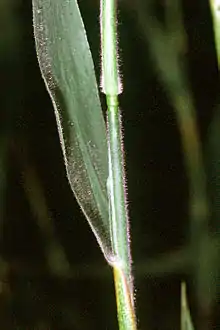 This rhizomatous perennial grass produces a basal rosette of leaves in the fall and winter and then erect stems the following spring.[3] There are clumps of stems up to 1.5 meters tall. There are 7 to 11 hairy leaves up to 20 centimeters long by 2 wide on the stem. There are two types of inflorescence. The main panicle has flowers that open and are pollinated. There are also cleistogamous flowers that do not open and fertilize themselves. These develop later in the season.[2] There are about 380,000 seeds per pound.[3]