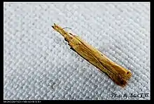 The wingspan is 12–16 mm (0.47–0.63 in). The forewings are whitish ochreous or yellow ochreous, sometimes strewn with strigulae of fuscous irroration (sprinkles). There is a streak of dark fuscous suffusion or irroration along the costa from the base to four-fifths and a black dot beneath the costa near the base. The stigmata are black, with the discal approximated, the plical often little marked, beneath the first discal. There is a small apical spot of dark fuscous suffusion. The hindwings are pale grey, thinly scaled anteriorly.[4]