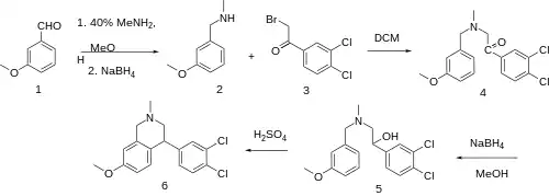 The condensation of m-anisaldehyde [591-31-1] (1) with methylamine gives N-methyl-3-methoxybenzenemethanimine [16928-30-6]. Reduction of this Schiff-base intermediate with sodium borohydride gives (3-methoxybenzyl)methylamine [41789-95-1] (2). Alkylation of this with 3,4-dichlorophenacylbromide [2632-10-2] (3) would give CID:59580342 (4). Reduction of the benzoyl ketone with sodium borohydride gives the alcohol [802051-24-7] (5). Acid catalyzed intramolecular cyclization then completes the synthesis of the 4-aryl-THIQ derivative, diclofensine (6).