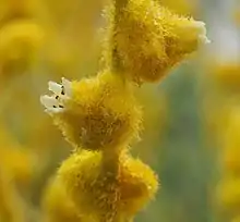 Dicrastylis beveridgei is a shrub, growing to 1 m high, in red sand, on sand dunes. Its stems are roughly circular in cross section. The opposite and entire leaves are 10โ22 mm long by 2.5โ5 mm wide, and have branched (dendritic) hairs, and a blistered, puckered surface. There are no bracteoles, but there are bracts which are 2.2-2.5. mm. The flowers are sessile. The calyx has five lobes (0.8-1.2 mm long), which are covered in dendritic hairs, and the yellow and white corolla is 3โ4 mm long, with no dots or stripes in its throat. There are five stamens. Flowers may be seen from January to December.[4]