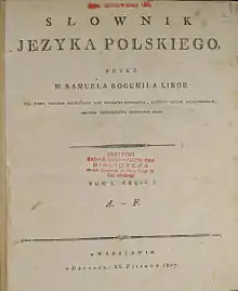 Many dictionaries in the Polish language and dedicated to the Polish language bear the generic name Słownik języka polskiego (lit. the Dictionary of the Polish Language).[8] The first such dictionary was published by Samuel Linde in the early 19th century (in six volumes from 1807 to 1814) and had 60,000 entries.[4][9][8] Numerous other dictionaries of the Polish language have been published since.[8] The ones following in Linde's path include the 110,000-entry Słownik języka polskiego published in Wilno in 1861 by a group of Polish scholars led by Aleksander Zdanowicz[10] and the 270,000-entry Słownik języka polskiego edited by Jan Aleksander Karłowicz, Adam Kryński and Władysław Niedźwiedzki, published in several volumes from 1900 to 1927.[11] After World War II, a major dictionary of the Polish language was the Słownik języka polskiego of Witold Doroszewski, published in volumes from 1958 to 1969, which quickly became considered a new classic.[12]