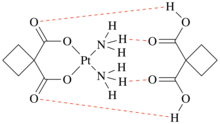 Dicycloplatin consists of carboplatin and cyclobutane-1,1-dicarboxylic acid (CBDC) linked by the hydrogen bond. In the structure of dicycloplatin, there are two types of bond: O-H...O is the bond between the hydroxyl group of CBDC with carboxyl oxygen atom. It creates the one-dimensional polymer chain of carboplatin and CBDC. The second one is N-H...O which links between the ammonia group of carboplatin and oxygen of CBDC. It forms the two-dimensional polymer chain of carboplatin and CBDC. In aqueous solution, the 2D-hydrogen bonded polymeric structure of dicycloplatin is destroyed. Firstly, the bond between ammonia group of carboplatin and oxygen of CBDC breaks, thus inducing the formation of one-dimensional dicycloplatin. After that, the strong hydrogen bond breaks and creates an intermediate state of dicycloplatin. Finally, the rearrangement of different orientation of carboplatin and CBDC leads to the formation of intramolecular hydrogen bond and a supramolecule of dicycloplatin with two O-H...O and N-H...O is created.[5]