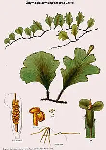 The genus Didymoglossum was first described by Nicaise Auguste Desvaux in 1827.[1] Its status, like other genera in the subfamily Trichomanoideae, remains disputed. The Pteridophyte Phylogeny Group classification of 2016 (PPG I) accepts the genus, placing it in the subfamily Hymenophylloideae and saying that there are about 30 species.[3] As of October 2019, the Checklist of Ferns and Lycophytes of the World listed 55 species,[1] whereas Plants of the World Online sank the genus into Trichomanes.[4]