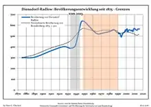 Development of Population since 1875 within the Current Boundaries (Blue Line: Population; Dotted Line: Comparison to Population Development of Brandenburg state; Grey Background: Time of Nazi rule; Red Background: Time of Communist rule)