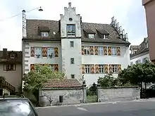 Diessenhofen is first mentioned in 757 as Deozincova.[3] In 2000, the village of Willisdorf was incorporated into the municipality. The earliest traces of a settlement are Stone and Bronze Age scattered objects found in the shallow valleys of the district and on the banks of the Rhine. A hoard of coins from the Roman era (251–270), and the remains of three towers of the Danube-Iller-Rhein limes (4th century) show Roman settlements in the area. The reference in a deed of the Abbey of St. Gall from 757 mention an Alamanni village, which was probably on the plateau south of the church. In 1178 Count Hartmann III of Kyburg, raised the village to town and probably appointed a Ministerialis (unfree knights in the service of a feudal overlord) family as the Stewards of Diessenhofen. By 1245, at the latest, it was the center of a bailiwick and a castle was built in town. Compared to Schaffhausen and Stein am Rhein, Diessenhofen was a modest market town. Hartmann granted the town a measure of freedom and self-government. He used the castle and bridge over the Rhine to secure and defend his possessions on both sides of the Rhine. After the extinction of the Kyburgs and the transition of sovereignty to the Habsburgs in 1264, the city developed as one of the cornerstones of the region. The Stewards, who sat at Unterhof Castle, temporarily united both the Vogt and Schultheiss offices into a single person. By 1320 the citizens chose a Town Council of 8–12 members, and during the 15th century this evolved into a 24–28 member Grand Town Council. In 1349, the Duke of Austria wrestled the Vogt office away from the Stewards and granted it to another Ministerialis. These two developments made citizenship rights in Diessenhofen increasingly important.[3]