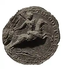Count Diederik I of Limburg had three sons, Hendrik, Johan and Everhard. The eldest, Hendrik, died young around 1248. Brother Johan died before May 1277. Everhard died before May 28, 1308, aged 55. During their lifetime, both deceased brothers were not known by charter as Count of Limburg. In the kept original charters of January 28, 1287 and May 20, 1296, just Everhard appears as a count together with his father Diederik. “Theodericus comes senior de Lymburg” & “Everhardus comes de Lymburg” with the edge lettering of his seal COMITIS EV(erhar)DI LIMBURGE(nsis) On coins of his descendants THEODERI-COMES. Diederik I's patrimony was guaranteed in 1296 by son Everhard I and grandson Diederik III(II). Who was 20 years old at the time. Everhard for more than 30 years, together with his father, contributed the struggle for the conquest of the county and former allodial Isenberger family property. In 1301 he was the 'nearest in the bloodline',[2] and succeeded his father.