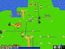 Dig Dug Island: Minami no Jima no Pukapukapon[lower-alpha 1] was a massively multiplayer online (MMO) video game developed by VerX and published by Namco Bandai Games exclusively for Japan. Beta testing began on December 21, 2007, followed by a public release on May 8, 2008. Based on Namco's Dig Dug video game series, specifically the 1985 direct sequel Dig Dug II, up to four players were tasked with defeating each of the enemies on a large, randomly-generated island. Enemies could be defeated by either pumping them up with air until they pop, or by drilling along fault lines to sink sections of the island they are standing on into the ocean. Players were given a custom island villa that could be customized with buildings and items that could be purchased with in-game currency.