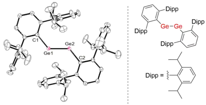 The first stable digermyne 2,6-Dipp2H3C6GeGeC6H3-2,6-Dipp2 (Ar1GeGeAr1, Dipp = 2,6-diisopropylphenyl) was synthesized and characterized by Philip P. Power and co-workers in 2002.[5] Reductive coupling of bulky 2,6-Dipp2-C6H3 (Ar1) group protected Ge(II) monochloride (Ge(Cl)Ar1) under the treatment of potassium in tetrahydrofuran (THF) or benzene gave the formation of Ar1GeGeAr1. The core structure C1-Ge1-Ge2-C2 has a centrosymmetric trans-bent feature, with the C1-Ge1-Ge2 angle of 128.67(8)° and a considerably short distance of 2.2850(6) Å between two Ge atoms. It has a good conjugation between two terphenyl rings and C1-Ge1-Ge2-C2 plain because of the nearly zero torsion angle (0.4°) presented. Similar molecule, designated Ar2GeGeAr2 has been calculated before the characterization of Ar1GeGeAr1, with the optimized trans-bent core structure protected by even more crowded 2,6-Trip2C6H2 (Ar2, Trip = 2,4,6-triisopropylphenyl) groups.[4] The trans bending in Ar2GeGeAr2 (123.2°) is comparable with Ar1GeGeAr1, and the Ge-Ge distance of 2.277 Å also differs little from that of Ar1GeGeAr1. Ar2GeGeAr2 was obtained using the same reduction method[6] and afforded the structure similar to the calculated one and Ar1GeGeAr1.