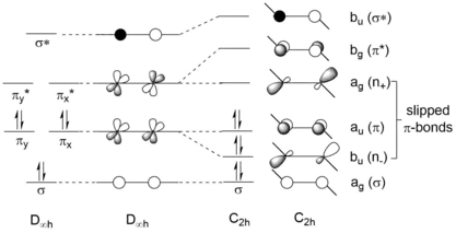 In a molecular orbital (MO) description, the geometrical distortion (trans-bent structure) of digermynes is the consequence of the second order Jahn-Teller (SOJT) effect, which is the symmetry allowed interaction between filled bonding MO (generally the HOMO in digermynes) and empty nonbonding or antibonding MOs (usually the latter one) that are close in energy and can lead to large molecular distortion. If constraining the digermyne molecule in D∞h point group, two Ge atoms will form one low-lying σ-bonding orbital, two degenerate π-bonding orbitals and π-antibonding orbitals, and one high-lying σ-antibonding orbital, which are the same as alkynes. SOJT mixing of in-plain π-bonding orbital (πx, HOMO) and σ-antibonding orbital, which have the same bu symmetry in the trans-bent C2h point group, give rise to a slipped π-bond with significant non-bonded electron lone pair character which is lower in energy, as well as a σ-antibonding orbital with higher energy. This second order mixing of MOs leads to the molecular distortion in geometry from linear D∞h to trans-bent C2h. The mixing of σ-bonding orbital and in-plain π-antibonding orbital (πx*, LUMO) is also symmetrically (both are in bg symmetry) and energetically allowed. Noticing that large SOJT effect occurs between two orbitals with energy difference of 2 eV or even larger, for example, 4 eV, the extent of mixing of orbitals is neglectable in alkynes, but is maximized in heavier elements, like Ge atoms in digermynes.[12]