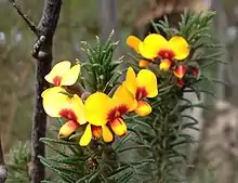 Dillwynia acicularis is a species of flowering plant in the family Fabaceae and is endemic to New South Wales. It is an erect shrub with linear, grooved leaves and yellow flowers with red markings.