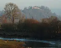 Dinefwr Castle (also known as Old Dynevor Castle) is a ruined castle overlooking the River Towy near the town of Llandeilo, Carmarthenshire, Wales. It lies on a ridge on the northern bank of the Towy, with a steep drop of one hundred feet to the river. Dinefwr was the chief seat of the Dinefwr dynasty of the Kingdom of Deheubarth. The castle is a Grade I listed building.[1]