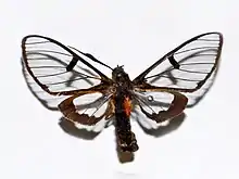The wings are hyaline (glass like), except to the black veins and borders. The forewings show a black band across the base, and the hindwings have a broad black band on the hind border. The head and thorax are black, while the abdomen is mainly red with a black tip.[1]