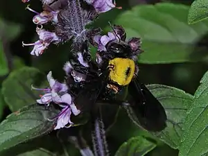 Female Xylocopa pubescens. Symbiotic mites (Dinogamasus sp.) can be seen in the bee's acarinarium.